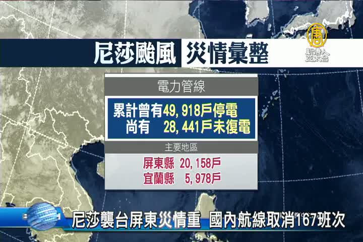 【新唐人亞太台 2017 年 07 月 29 日訊】再來關心,中颱尼莎挾帶豪大雨,目前,屏東地區,已經受到嚴重的衝擊,災情慘重。從中午開始出現長時間強降雨,許多地方時雨量超過100毫米,佳冬鄉更在3小時內創下419.5毫米的驚人雨量。水利署緊急出動17部抽水機配合縣府救災。根據中央災害中心統計,截至下午七點,全台累積曾有49918戶停電,28441戶未復電,主要地區為屏東縣以及宜蘭縣。目前累積疏散撤離3035人;另外,在交通運輸部分,台鐵:西部幹線對號列車、內灣線、集集線自下午六點到半夜12點停駛,東部幹線對號列車、南迴線、平溪線停駛;空運:國內航線取消167班次,國際航線取消131班次。