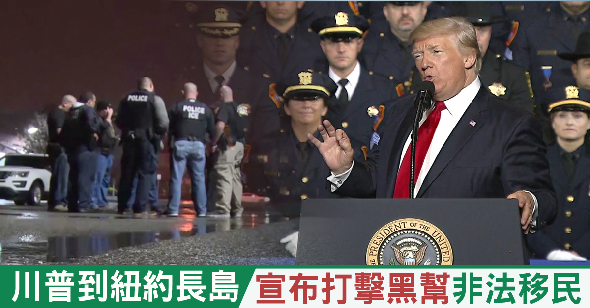 美國總統川普在紐約長島呼籲加強打擊MS-13等黑幫組織。他要求國會增加撥款,用來加強維持邊境秩序,加速遞解參與黑幫的無證移民。