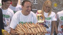 2011-07-06 21:42:08美國每年國慶日在紐約市康尼島,都會舉辦的「納森」熱狗大胃王比賽」重頭戲,日前登場,已經四連霸的切斯納再度奪冠,贏得一萬美元和冠軍腰帶。不過,前任冠軍日本小林尊,則是在10分鐘內吃下69根熱狗麵包,馬上刷新了由切斯納在2009年所創下68根熱狗麵包的世界記錄。