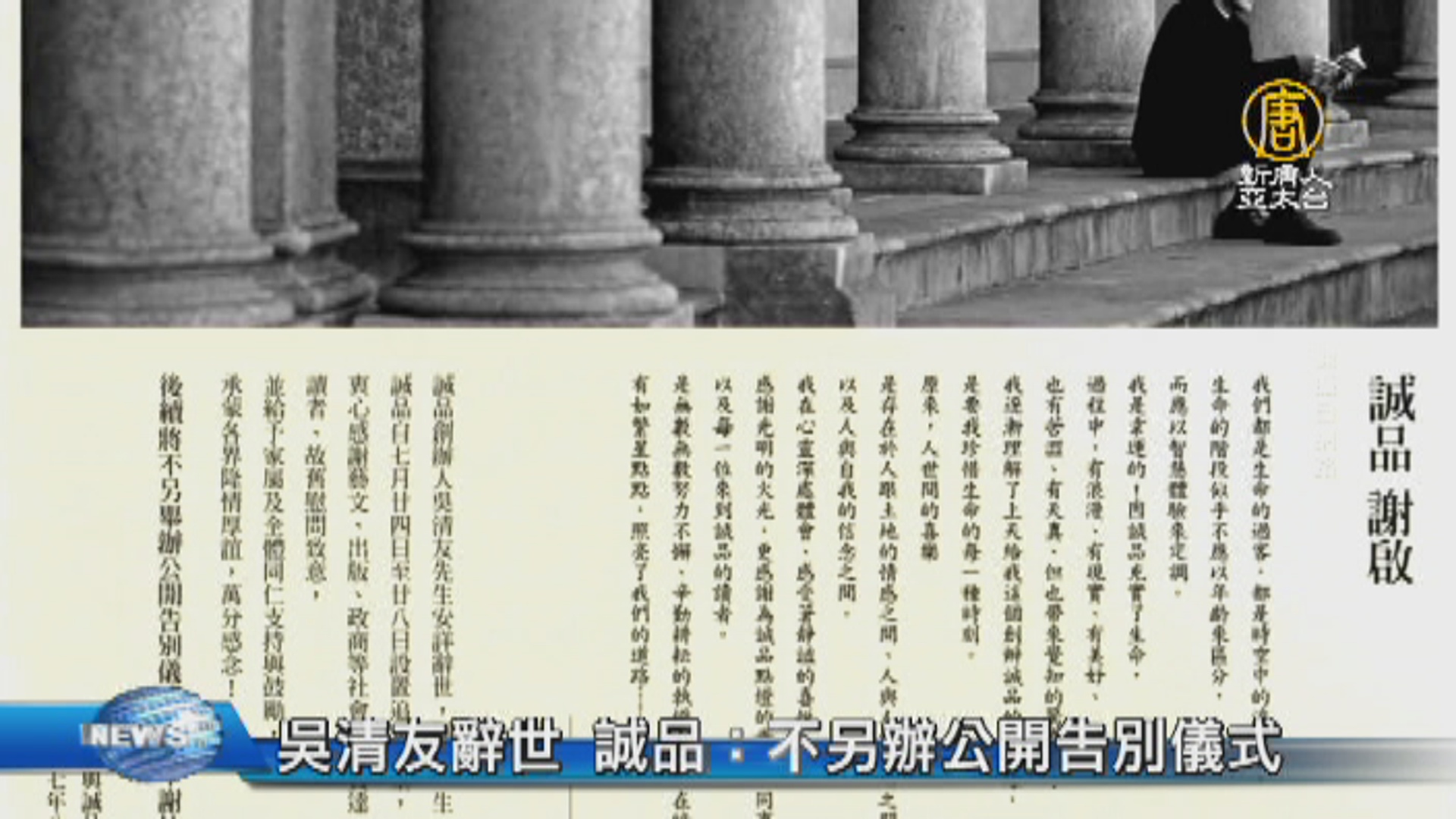 【新唐人亞太台 2017 年 08 月 03 日訊】誠品創辦人吳清友日前因病過世,誠品今天在四大報頭版刊登半版廣告感謝各界慰問致意,並說明在7月24日到28日設置追思會堂後,後續將不另舉辦公開告別儀式。