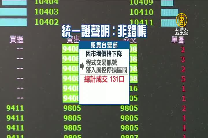 【新唐人亞太台 2017 年 08 月 04 日訊】台指期 昨天開盤後不久,瞬間打到跌停價9408點,上午一度傳出,是交易員下錯單,引發市場擔憂。不過統一證券表示,主因是指數下跌 觸動期貨停損交易。金管會表示,這次事件規模空前,目前 查無錯帳情況,至於是什麼原因造成指數重挫,還要再了解。
