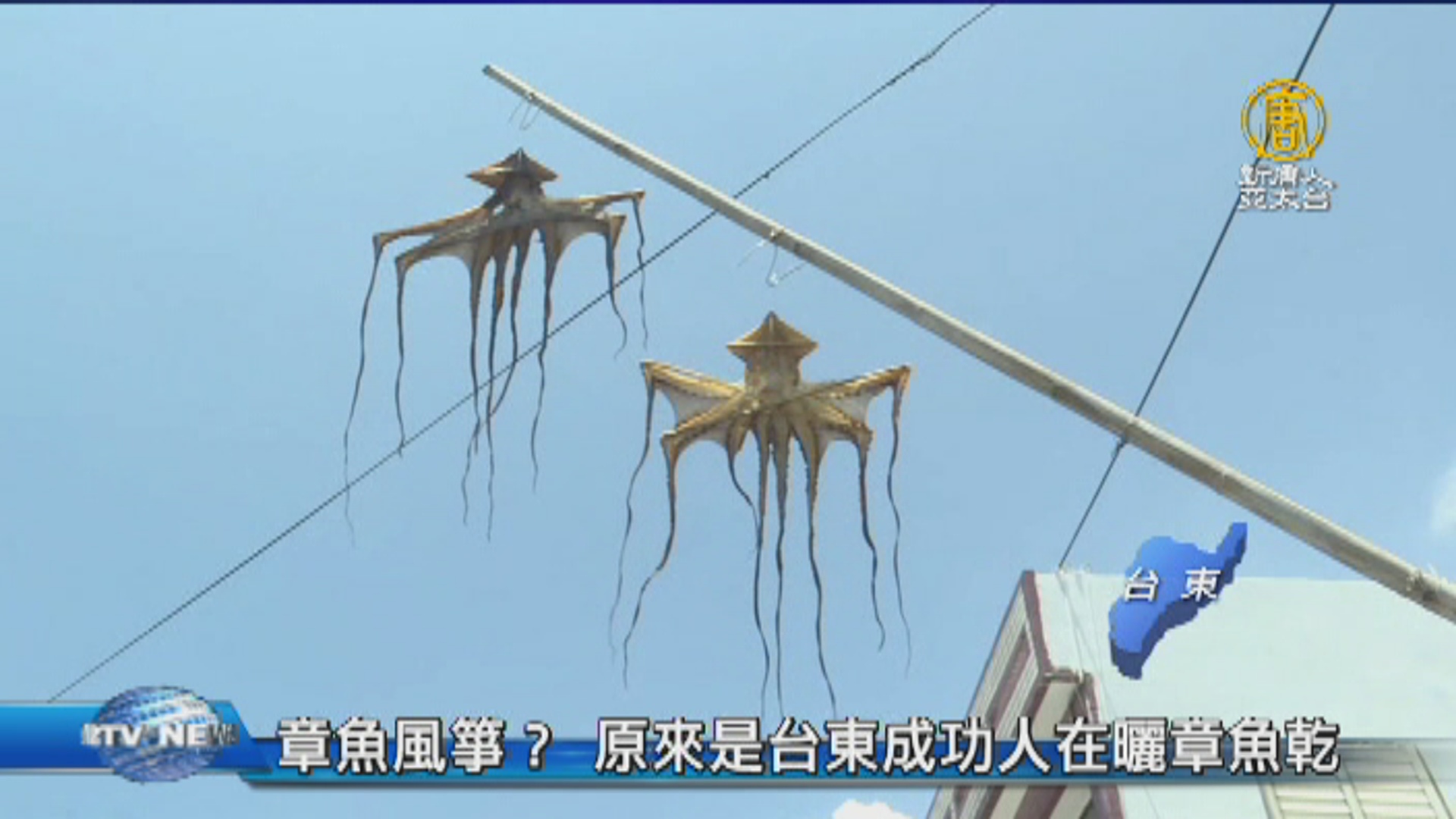【新唐人亞太台 2017 年 08 月 04 日訊】風箏的造型越來越多樣,不過您有看過活章魚做成的風箏嗎?奇特景象就出現台東成功鎮,當地居民為了保留風味,把章魚剖開,掛在竹竿上曬成章魚乾,遠遠看就像在放風箏,遊客經過都覺得不可思議。