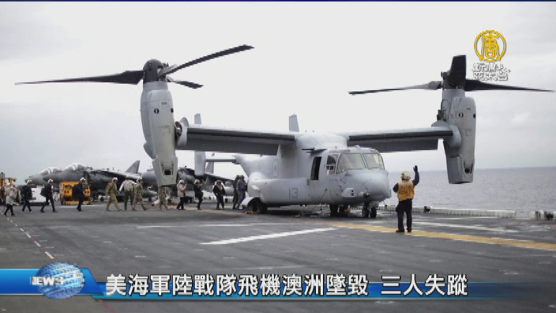 【新唐人亞太台 2017 年 08 月 06 日訊】歡迎回來。美國海軍陸戰隊一架MV-22魚鷹機,週六,在澳洲外海墜毀,機上26人中,有23人獲救,3人下落不明。美軍出動船隻和直升機搜救。