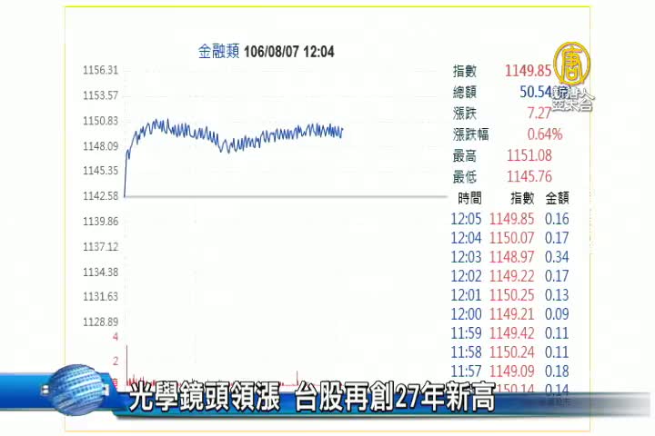 【新唐人亞太台 2017 年 08 月 07 日訊】來關心台股,今天開盤才幾分鐘,就再創27年來新高,今天買盤增溫,光學鏡頭股持續獲買單拉抬,金融股也同步走揚,帶動指數突破前波高點,盤中順利攻上10563.16點,創27年來新高,預估量能約1300億元。而受到鴻海加碼投資美國密西根州激勵,帶動車用股鴻海子弟兵乙盛 早盤亮燈漲停,鴻海更在接近11點時,出現一筆8601張的巨量敲進鴻海,順勢將加權指數再推向今日高點,突破近27年新高。