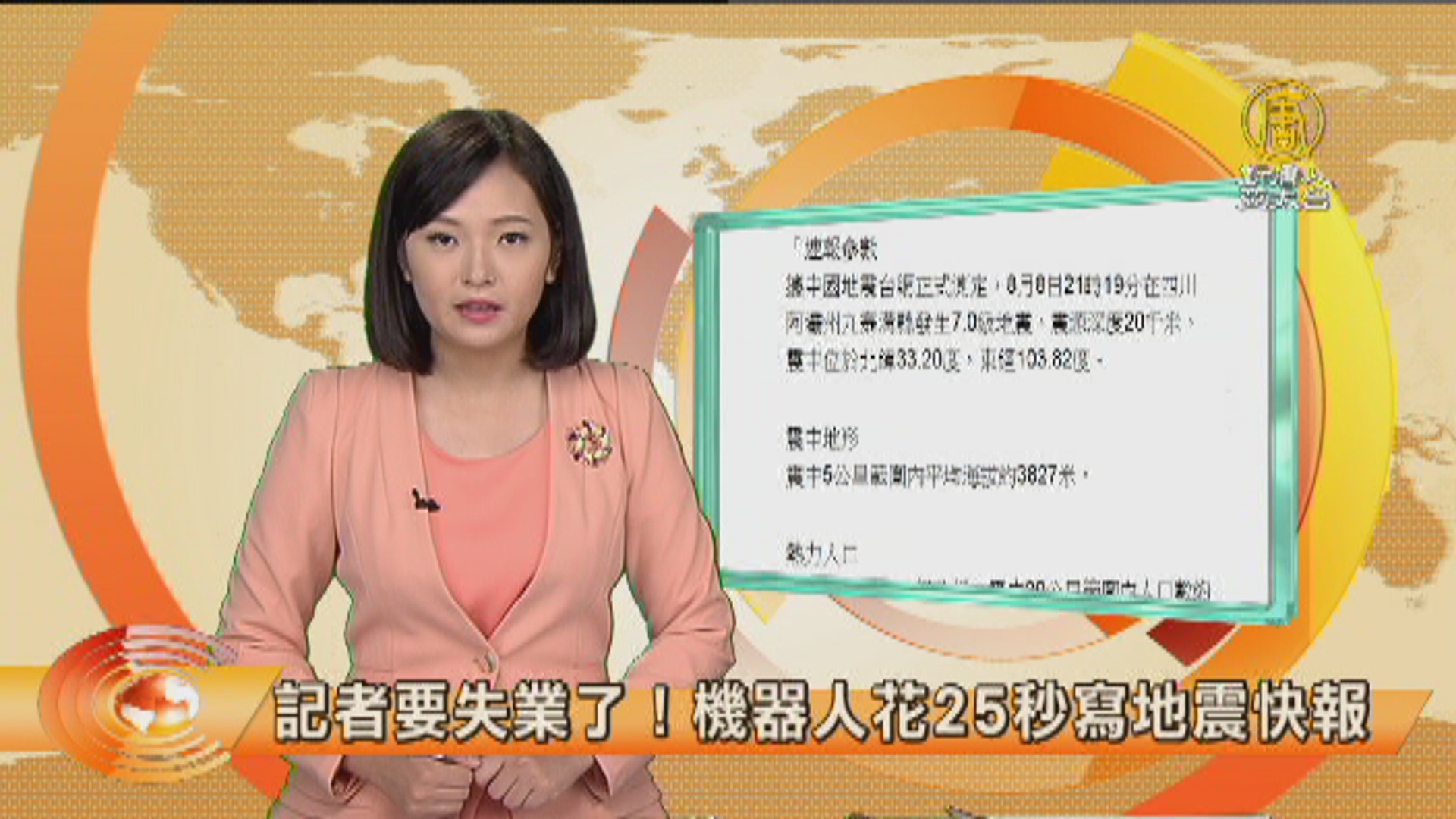 【新唐人亞太台 2017 年 08 月 09 日訊】記者要失業了!新聞界出現機器人來搶飯碗。中國地震台網中心 去年起和媒體合作,在地震發生後10秒內,便能由機器人,撰寫地震快報的新聞稿,並推播至行動裝置用戶手中。昨天發生的九寨溝地震,機器人也發揮功效,並在25秒內,就完成新聞稿。