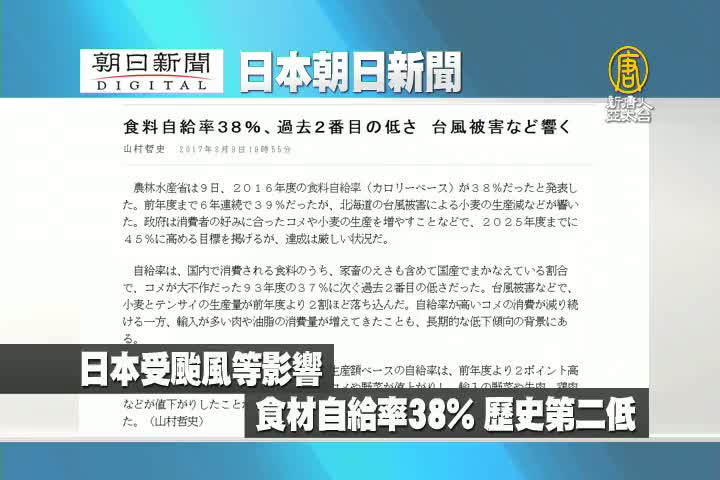 【新唐人亞太台 2017 年 08 月 10 日訊】來看到日本朝日新聞報導:日本受颱風等影響,食材自給率38%,歷史第二低。