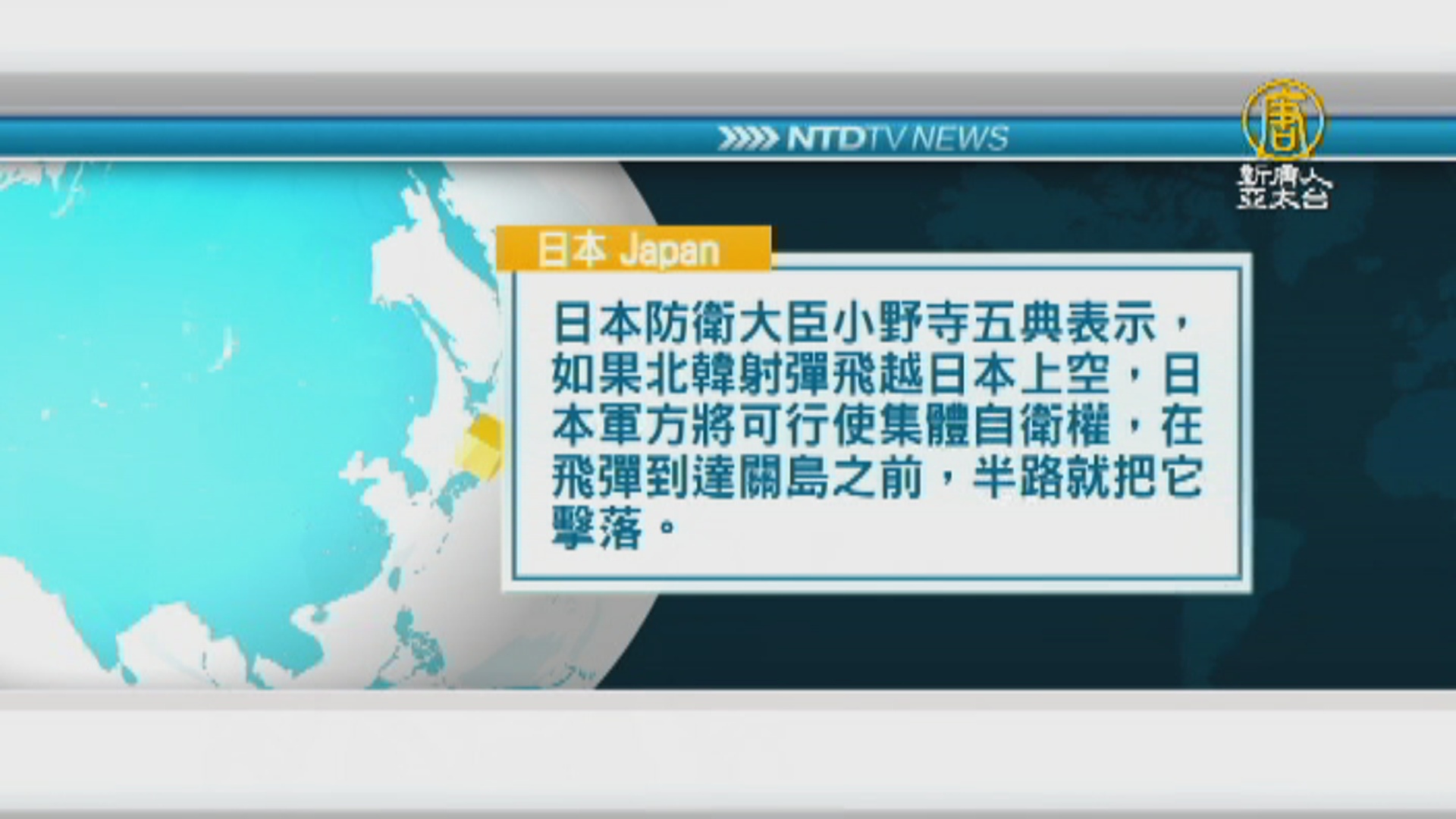 【新唐人亞太台 2017 年 08 月 11 日訊】日本防衛大臣小野寺五典表示,如果北韓射彈飛越日本上空,日本軍方將可行使集體自衛權,在飛彈到達關島之前,半路就把它擊落。