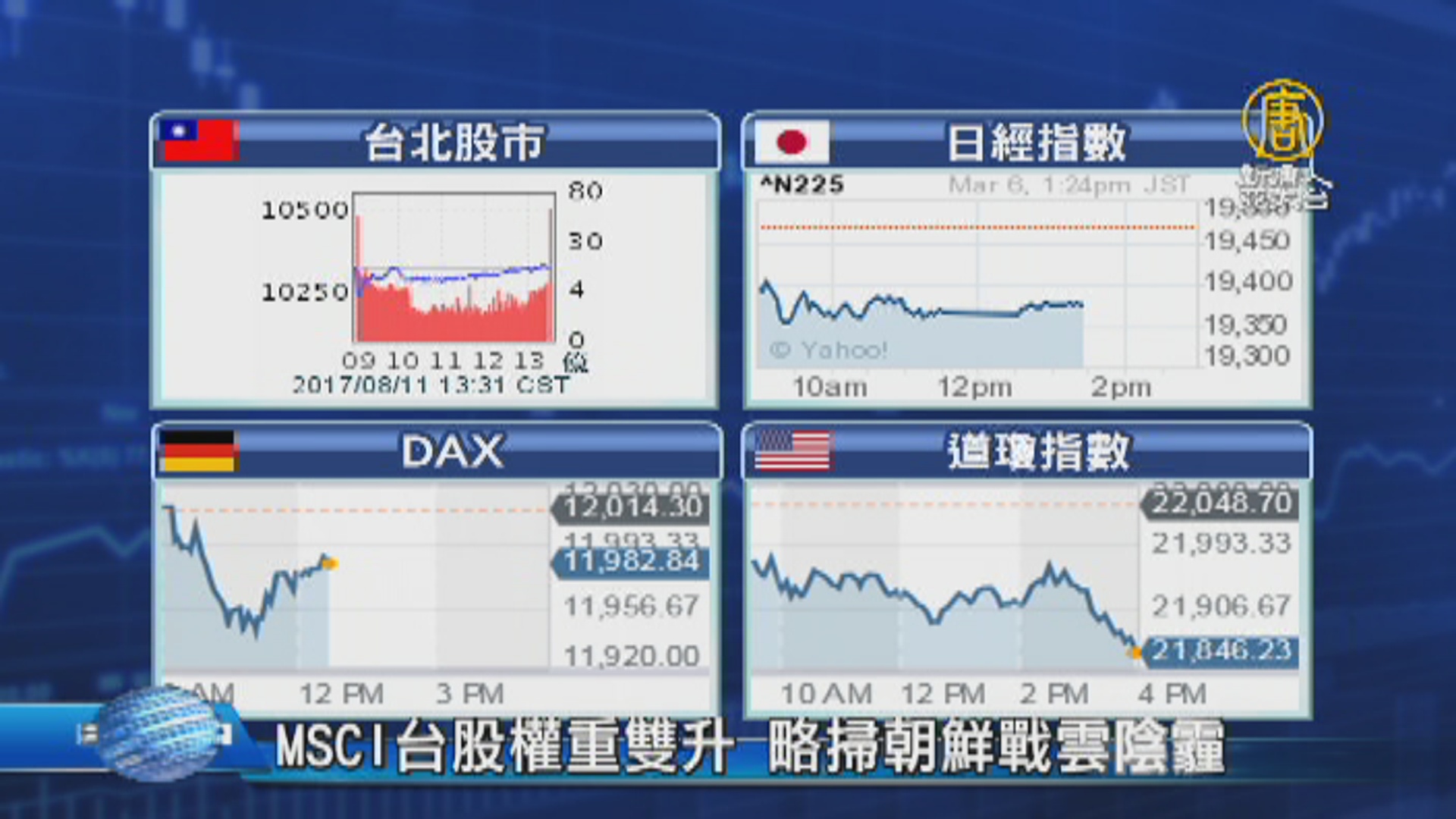 【新唐人亞太台 2017 年 08 月 11 日訊】美國與北韓對嗆,引發全球股市震盪,歐美股市昨天重挫,今天亞股,包括香港、中國、南韓跌幅都超過1%,台股今天也出現短線急跌,但因為MSCI近4年來首度調升台股權重,跌幅快速收斂,終場小跌0.17點,收在10329點,重新站回季線之上,成交值新台幣1136.46億元。而新台幣匯率今天表現依舊疲弱,終場貶值4.9分,以30.358元兌1美元作收,匯價連3貶,並創下超過半個月新低。