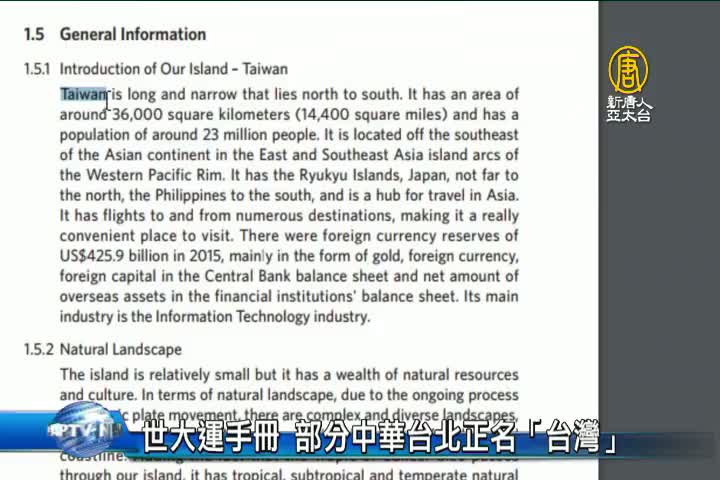 【新唐人亞太台 2017 年 08 月 12 日訊】2017世大運英文版介紹手冊,從頭到尾通通用「Chinese Taipei(中華台北)」引發批評。執委會最新更正,地理介紹的部分,已將「Chinese Taipei」修改為「Taiwan」,但賽事介紹、賽務訊息,因為須遵照奧會模式,仍維持不變。