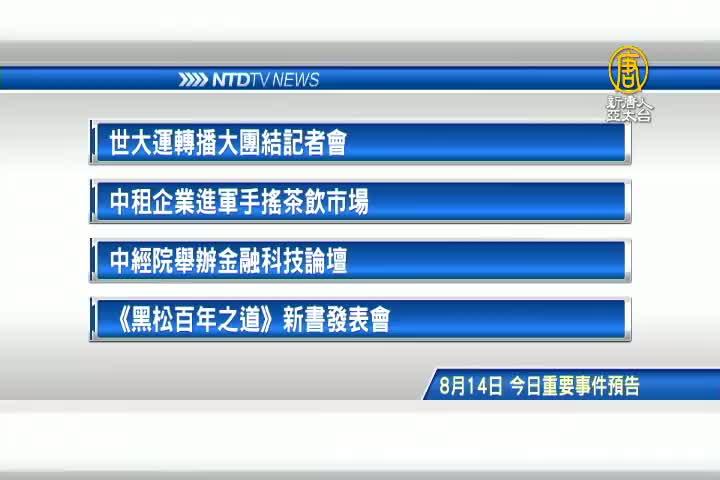 【新唐人亞太台 2017 年 08 月 14 日訊】接著看到,今天,8月14日,星期一 ,有哪些重要活動。首先是,世大運轉播大團結記者會;中租企業進軍手搖茶飲市場;中經院舉辦金融科技論壇;以及,《黑松百年之道》新書發表會。