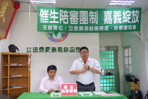 司改國是會議上周落幕,審判制度未定案,嘉義縣立委蔡易餘與陪審團協會創會理事長鄭文龍律師,今天(14日)上午在蔡易餘服務處召開「催生陪審團制」記者會;蔡易餘說,陪審法草案51條完成,獲17立委支持,反觀司法院擬推動參審制,至今還沒草案,他另提案推動陪審制配套法案,修改刑事訴訟法,改採起訴狀一本主義。