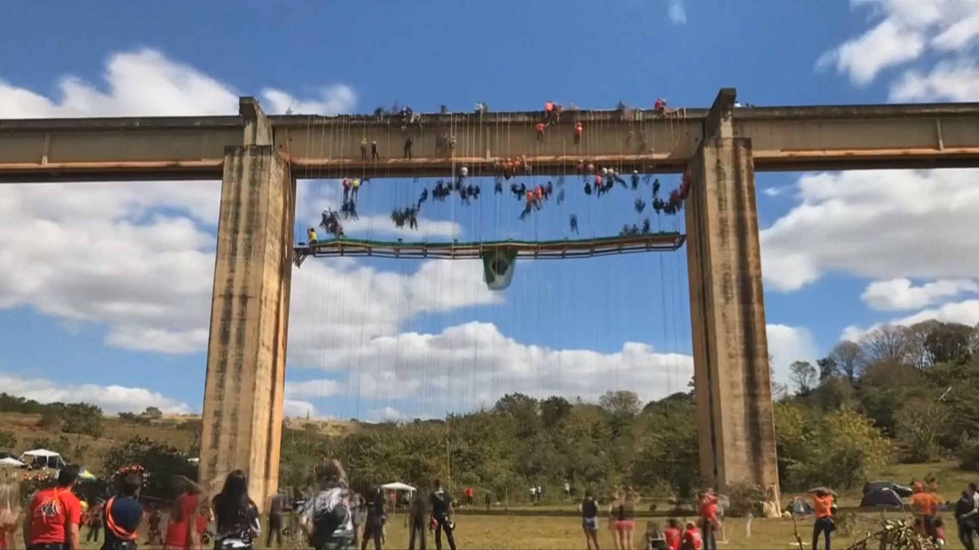 在巴西聖保羅州日前舉辦了一場高空烤肉,活動在一座廢棄的橋樑下舉行,主辦單位在兩個橋墩之間20公尺,大約是七層樓的高度懸掛了可供一百多人使用的長餐桌及完整的烤肉設備。