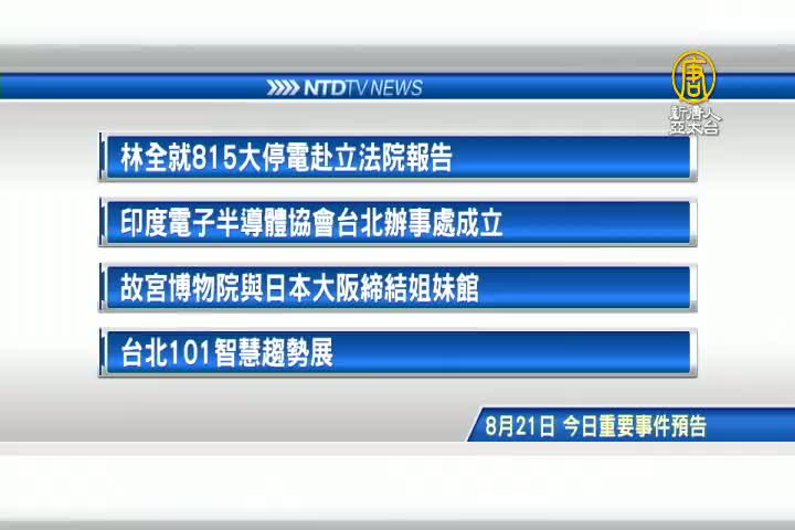 【新唐人亞太台 2017 年 08 月 21 日訊】接著看到,今天,8月21日,星期一 ,有哪些重要活動。首先是,行政院長林全,就815大停電事件,赴立法院專案報告並備質詢;印度電子暨半導體協會,台北辦事處成立;故宮博物院與日本大阪東洋陶瓷美術館,締結姐妹館;以及台北101,首度舉辦智慧趨勢展。