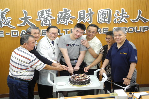 林弟弟跟醫療團隊人員一起切蛋糕慶重生。(義大醫院提供)