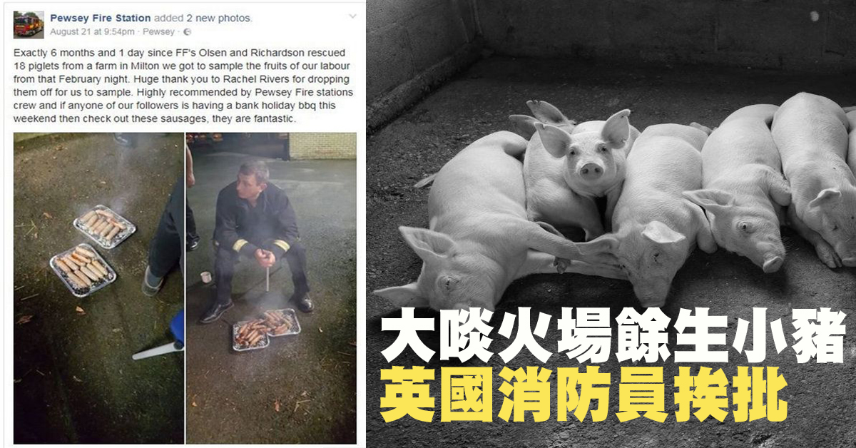 英國消防員半年前從火場救出小豬,養豬農將消防隊員救出的小豬做成香腸後,送給消防員,讓他們開心「品嘗努力的成果」,但此舉卻激怒動權團體,只好在臉書上道歉。
