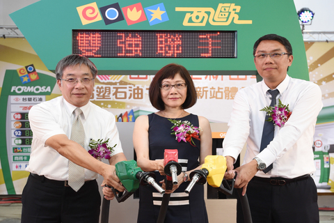 台塑石油【從心出發,全新出擊】發表記者會正式啟動。從左至右為:台塑石化副總經理許德雄、西歐加油站總經理劉秀薇以及台塑石化汽柴油營業處處長褚阮宗澤。(台塑石油提供)