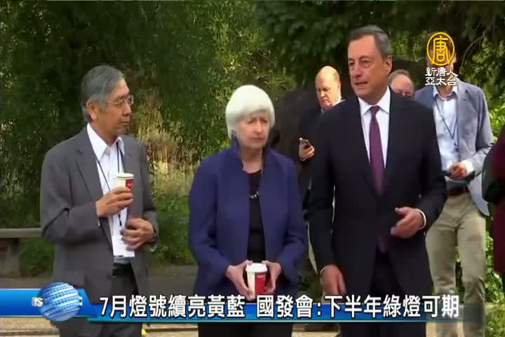 【新唐人亞太台 2017 年 08 月 28 日訊】再來看到,國發會今天公布 7 月分景氣概況,儘管並沒有符合原先外界預期,依舊維持「趨向低迷」的黃藍燈,不過國發會方面表示,從關鍵指標數據,呈現連續兩個月好轉,今年下半年第三季,有機會亮起代表穩定的綠燈,整體國際情勢和景氣,審慎樂觀。