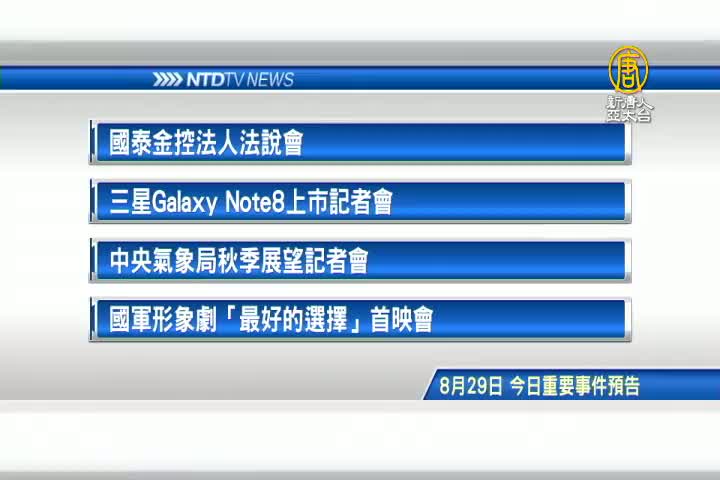 【新唐人亞太台 2017 年 08 月 29 日訊】接著看到,今天,8月29日,星期二 ,有哪些重要活動。首先是,國泰金控法人法說會;三星Galaxy Note8上市記者會;中央氣象局秋季展望記者會,以及,長榮航攜手泰國觀光局、與新北市政府三方合作,推廣觀光行銷。