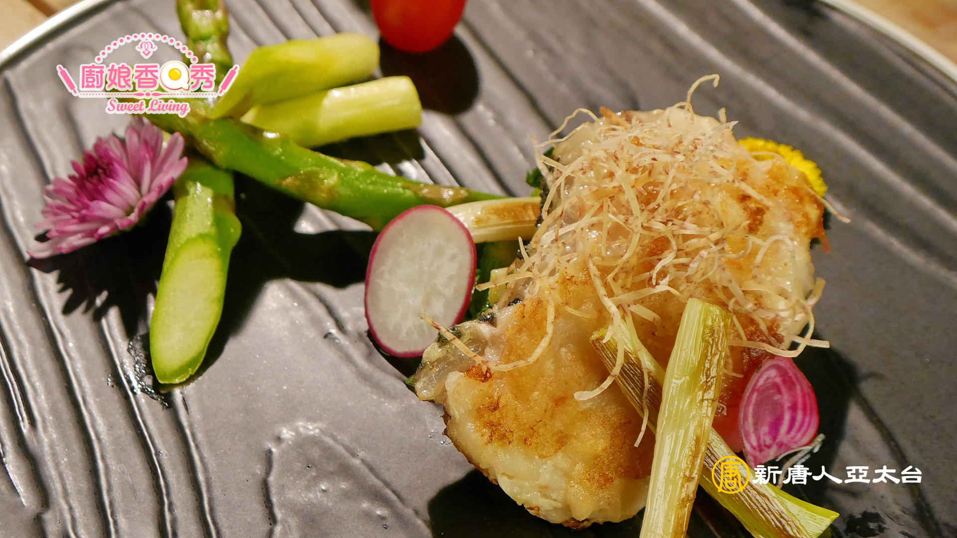 5. 三星蔥白煎熟後先取出,鍋離火將龍膽石斑翻面,並稍微壓一下用小火繼續煎,取出擺盤即可。