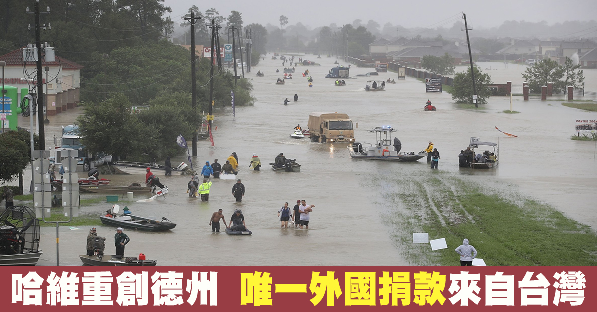 【新唐人亞太台 2017 年 09 月 02 日訊】再帶您來關心,美國哈維颶風,重挫德州,有多達10萬戶人家,受到影響,損失金額,恐怕飆升到420億美元,約新台幣1.27兆元,是美國史上損失最嚴重暴風雨的前5名。不過美國媒體卻發現,目前沒有多少國家向美國伸出援手,唯一的一筆國外捐款,竟然是,來自台灣。2005年卡崔娜颶風侵襲,有超過150國提供志工、補給品與現金援助美國,然而這次哈維風災後,卻很少有外國公開提供援助。歐盟,只以衛星幫美國記錄受災狀況。目前唯一一筆國外的捐款,還是來自台灣。