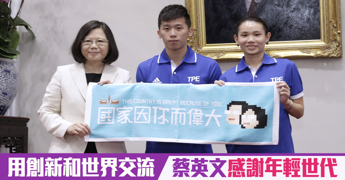中華民國總統 蔡英文:「剛剛結束的台北世大運,策劃開幕表演的三位導演,平均年齡才35歲,他們不僅展現台灣多元族群的內涵,更融入了數位設計,讓全世界的觀眾留下深刻的印象,讓台灣成為獨一無二的品牌。」