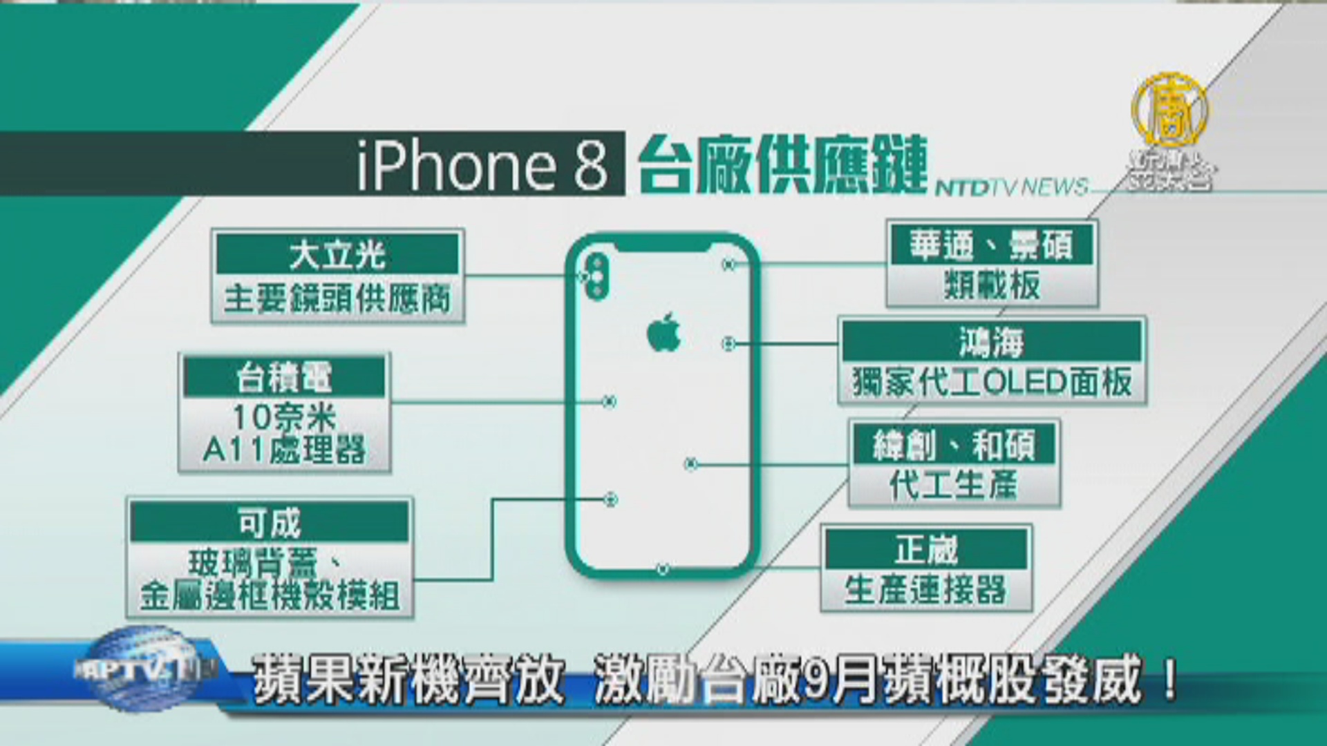 【新唐人亞太台 2017 年 09 月 02 日訊】市場期待的蘋果iPhone 8,將在這個月中登場,新機特色包括改採用玻璃背蓋機殼,搭載解析度更高的OLED面板及臉部辨識解鎖等,台韓蘋果供應鏈廠商備戰,更激勵台廠蘋概股發威,9月營收可望飆升。