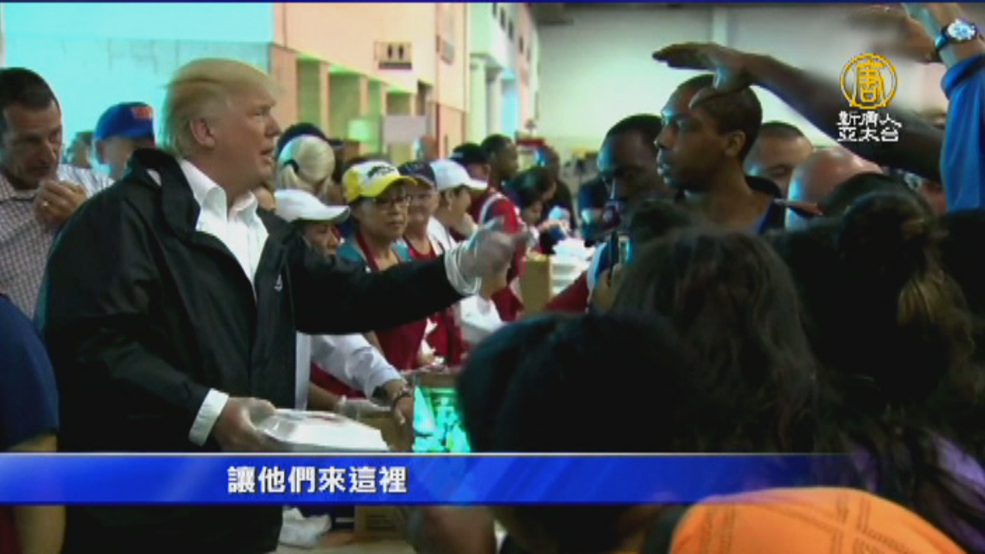 【新唐人亞太台 2017 年 09 月 03 日訊】繼續來關心,美國德州遭到哈維颶風摧殘,週六,美國總統川普與第一夫人梅蘭拉妮亞抵達受影響最嚴重的休斯頓市,在當地一間救濟中心,深入接觸當地災民,還當起了「服務生」,替他們分發食物。