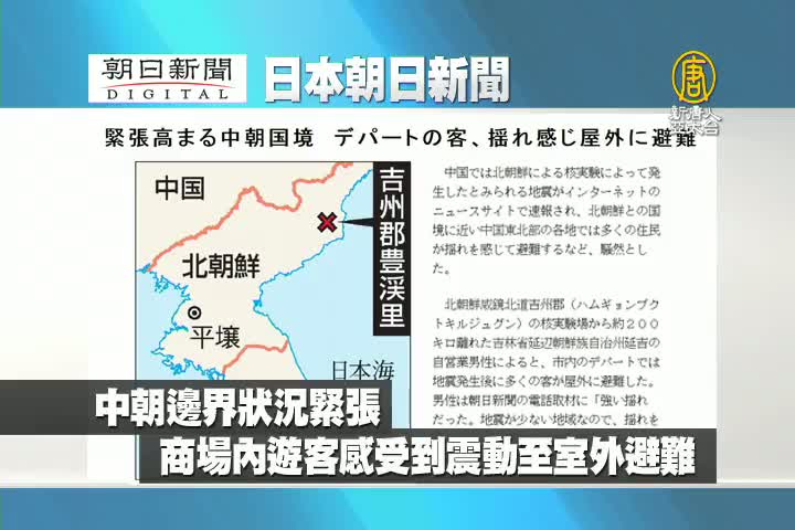 【新唐人亞太台 2017 年 09 月 04 日訊】來看到日本朝日新聞報導:核試驗導致中國與北韓邊界狀況緊張,商場內遊客感受到震動至室外避難。