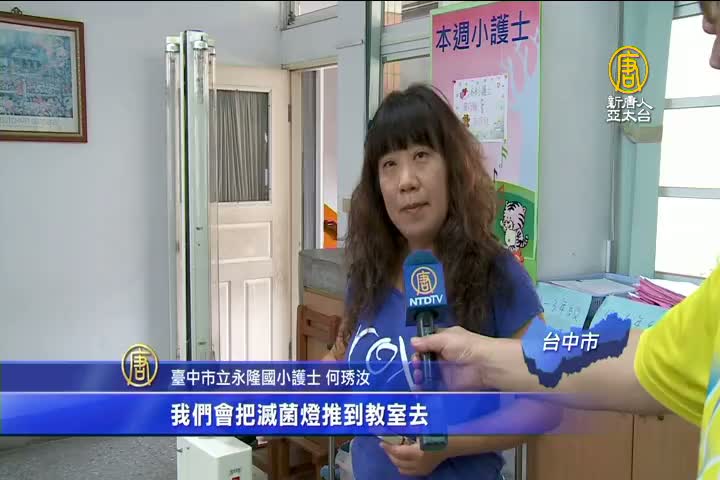 臺中市永隆國小護士 何琇汝:「除了班級做漂白水消毒之外,學校在小朋友放學之後呢,會淨空教室,我們會把滅菌燈推到教室去,幫教室做滅菌消毒。」