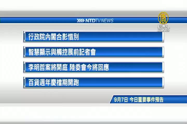 【新唐人亞太台 2017 年 09 月 07 日訊】接著看到,今天, 9月 7日,星期四 ,有哪些重要活動。首先是,行政院內閣改組,今天合影惜別,明天將正式交接。再來是,智慧顯示與觸控展,今天舉行展前記者會。另外,台灣NGO工作者李明哲,在中國被失蹤172天,即將開庭。陸委會今天例行記者會也將被問到相關問題。最後是民生消息,各大百貨週年慶檔期,今天開跑。
