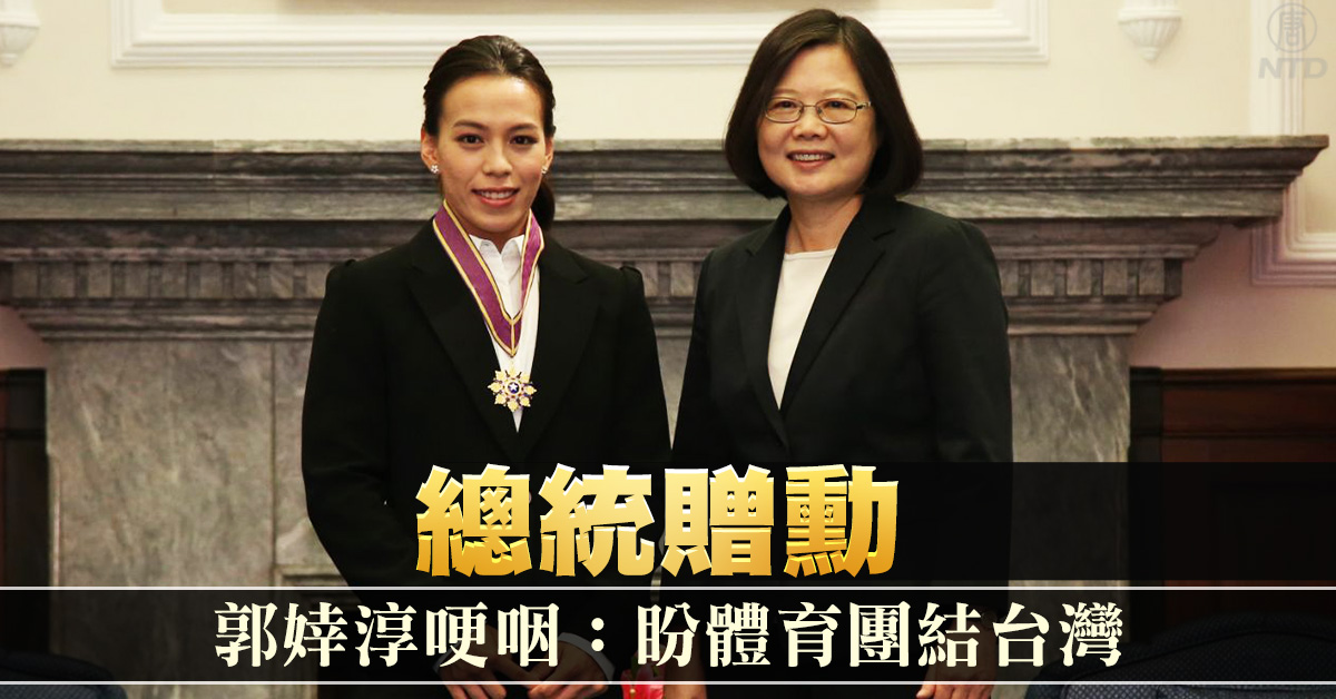 【新唐人亞太台 2017 年 09 月 07 日訊】舉重選手郭婞淳,在本屆世大運挺舉,打破已維持十年不動的世界紀錄,摘下金牌。不只感動國人,也燃起台灣民眾對體育的關心。蔡總統今天頒發「五等景星勳章」給郭婞淳,郭婞淳也一度哽咽表示說,希望體育,能讓台灣民眾,再次團結。