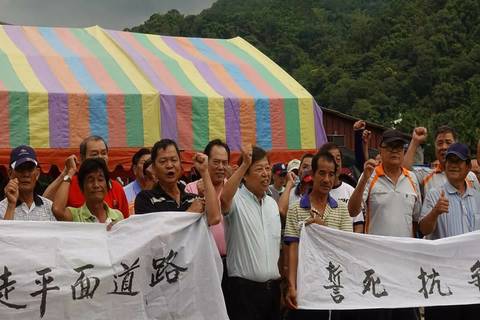 國姓鄉民不滿仁愛鄉疏浚砂石車行經平面道路,民眾拉白布條抗議陳情(國姓鄉公所提供)