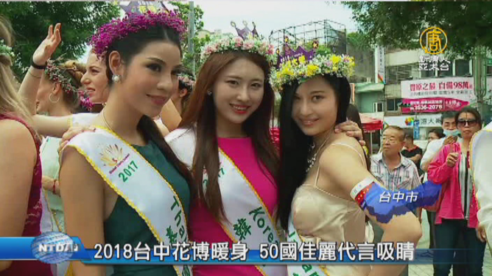 【新唐人亞太台 2017 年 09 月 14 日訊】一年一次的全球旅遊選美皇后比賽,今年決賽在台灣舉辦。50國的佳麗今天(14日)受邀到台中豐原,為2018台中花博暖身,各個頭戴花冠,甜美的笑容,一出場成為全場焦點。
