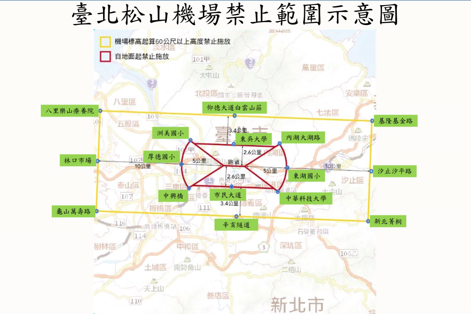 以松山機場為例,初步對照現有地圖,自台北市洲美國小往東經東吳大學至內湖大湖路,洲美國小往南經厚德國小至中興橋,自大湖路往南經東湖國小至中華科大,自中興橋往東沿市民大道至中華科大,此一區域內為施放禁區。