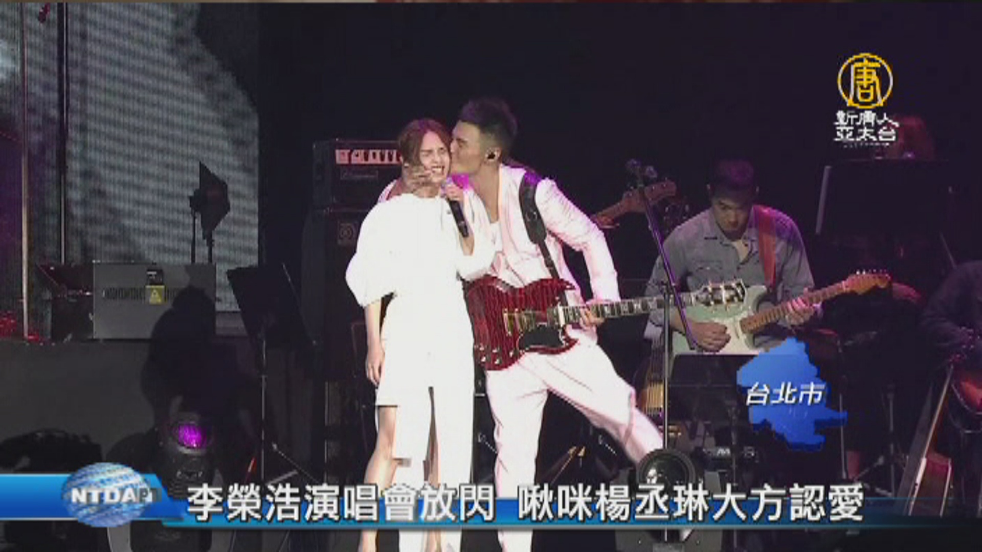 【新唐人亞太台 2017 年 09 月 17 日訊】歌手李榮浩首度在台北小巨蛋開唱就下猛藥,大方邀請女友楊丞琳擔任嘉賓。兩人一改過往低調大方認愛,居然當場朝女友的臉上霸氣獻吻,接著深情告白說,感謝女友楊丞琳一直以來的陪伴。楊丞琳則是用飛吻回敬,放閃程度破表。