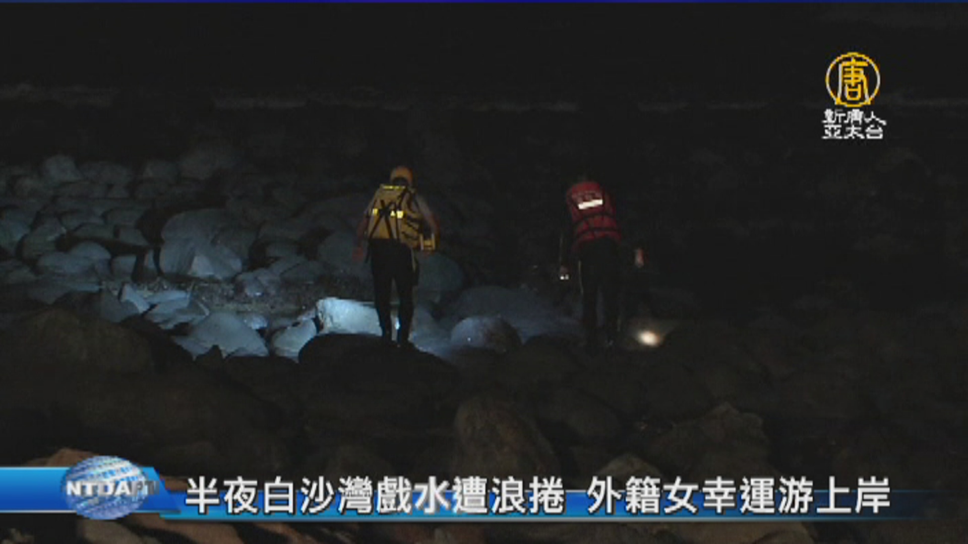 【新唐人亞太台 2017 年 09 月 17 日訊】今天(17日)凌晨發生了一起白沙灣驚魂,5名加拿大的遊客到白沙灣玩水,不料被一陣巨浪襲捲而來,把5個人全部沖散,其中4名男子自行游上岸,剩下的1名女子卻下落不明,消防隊搜索海域近2個小時都一無所獲,沒想到最後這名被捲走的女子,竟奇蹟似地自行游上岸。