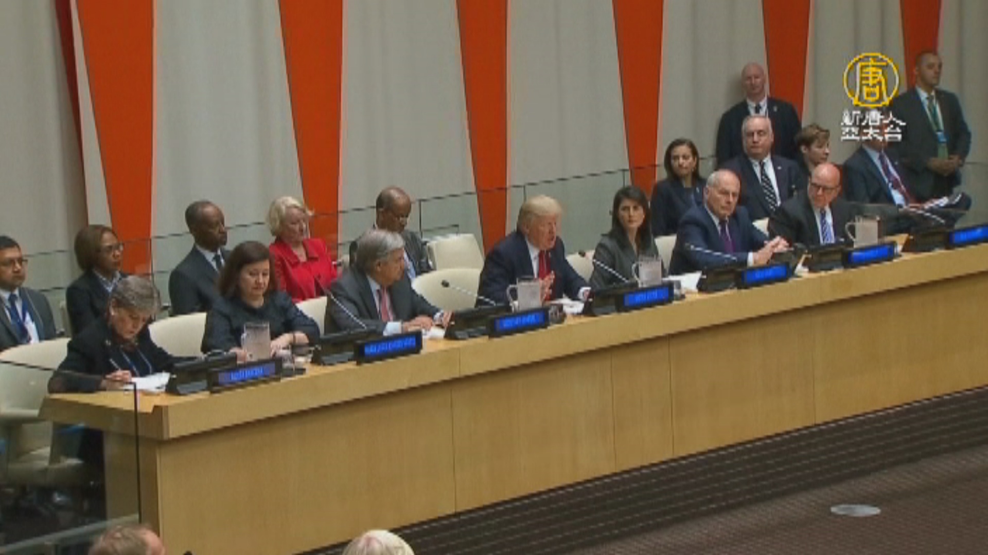 美國總統 川普:「近年來,聯合國未能完全實現目標,因為官僚主義和管理不善。聯合國的正常預算,已經增長了140%,2000年後,聯合國員工薪水翻了一倍,我們沒看到投資得到相應回報。但我知道在現任秘書長的管理下,情況變了,而且快速變化,我們看到了。所以我們肯定現任秘書長,支持他督促聯合國更多聚焦在人們,而不是聚焦官僚主義。」