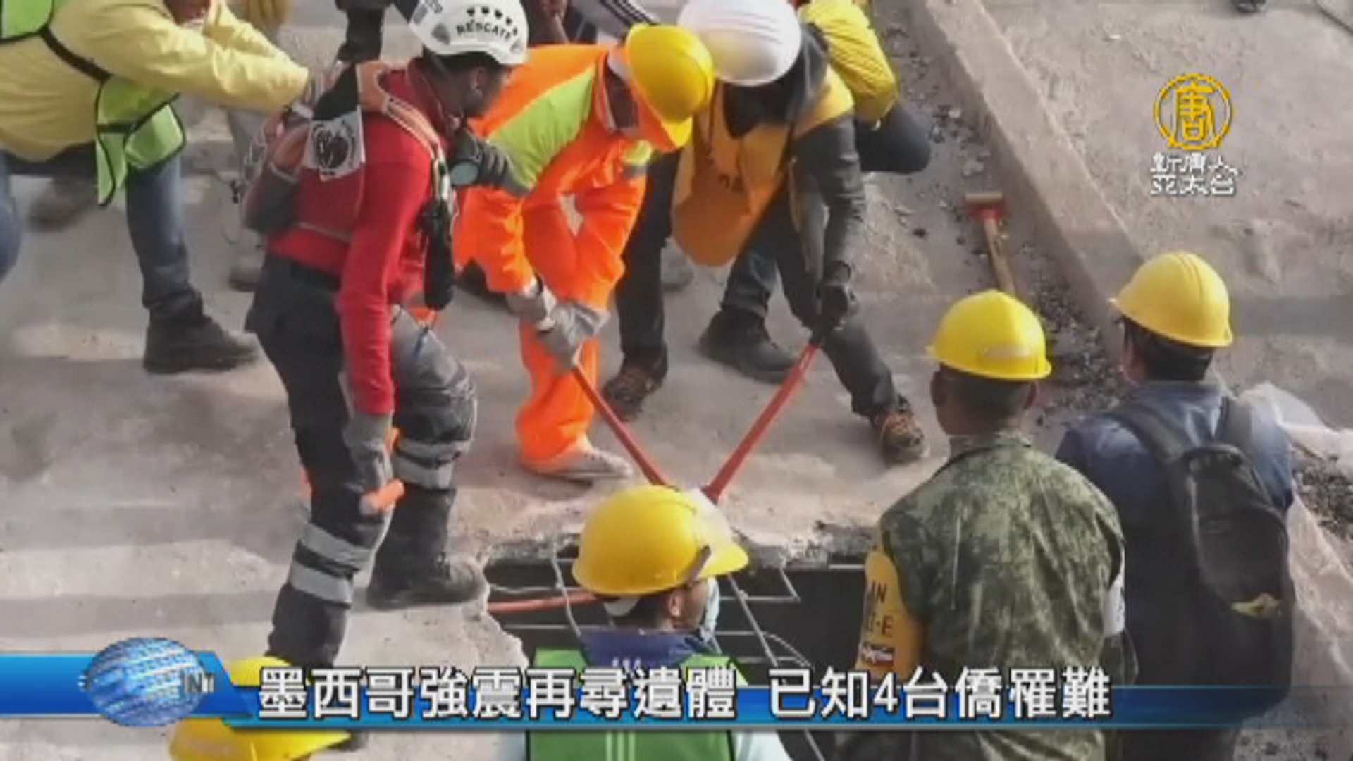 2017-09-22 07:41:08早安新唐人,先帶您關心,墨西哥7.1強震搜救的最新進度,雖然目前已經有國際團隊支援,但遺憾的是,稍早傳來的消息,五名受困的台灣僑民中, 有三人不幸罹難。 目前已經陸續尋獲林家慶、王家妤和金珮如的遺體,現在正在全力搜救金珮如的女兒黃嫻鈺,以及台灣籍員工 賴映遐。另外,救難人員20日發現一名十二歲女童在殘壁中擺動手指,告訴外界裡頭仍有五名孩童倖存。然而,過了十五小時,救難人員還是找不到方法進入救援。