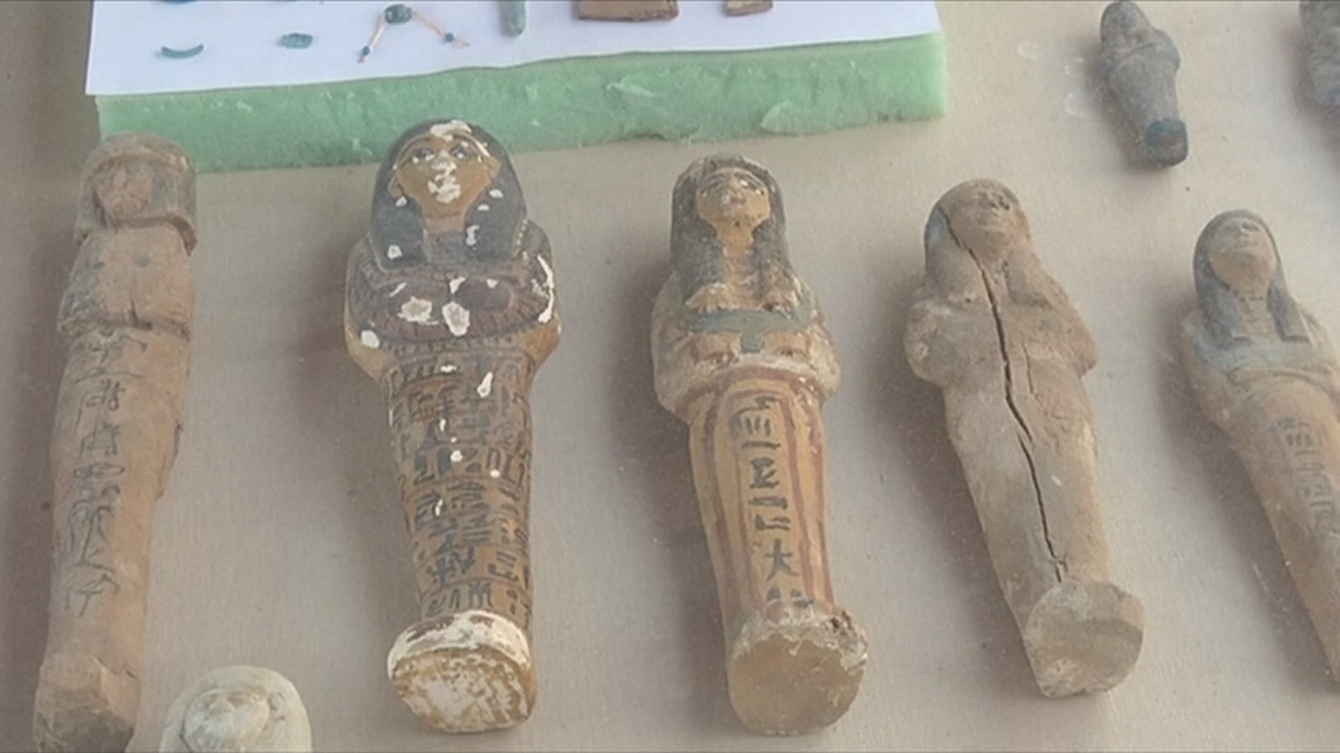 「這是最新發掘的第18王朝時期的一座古墓。墳墓的主人是生活在第十八王朝中期,約公元前15世紀的一位金匠。正如你在我身後看到的那樣,(這是)墳墓主人與妻子和他們一個兒子的雕像。 我們在墳墓內外發現了遺骸以及許多陪葬品。 我們發現了木乃伊、棺木、殯葬梳子、殯葬面具、一些首飾和雕像。挖掘工作還沒有完成,我們還在繼續挖掘當中,我們正努力在附近地區尋找更多的目標和更多的墳墓。」