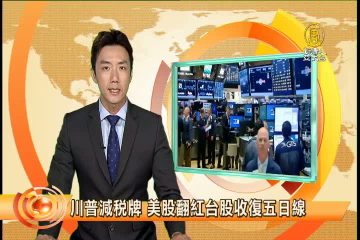 【新唐人亞太台 2017 年 09 月 28 日訊】好,川普端出減稅利多,美股3大指數全面收紅,台股今天開盤也漲24.74點,股王大立光、鴻海、台積電等權值股走揚,台股指數一路走高,成功收復5日線。
