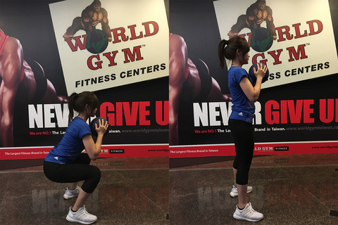 World Gym教練以專業壺鈴示範,雙手抱著壺鈴、放在胸前,胸部背部挺直、深呼吸,雙腳打開與髖同寬、腳尖膝蓋朝前(如附圖右)。接著,腹部收緊,臀部下移、膝蓋彎曲,想像屁股往下坐的感覺,把重心放在髖關節及下背部,下蹲時,下背部成直線、不要駝背,大腿和地面,保持平行(如附圖左)。