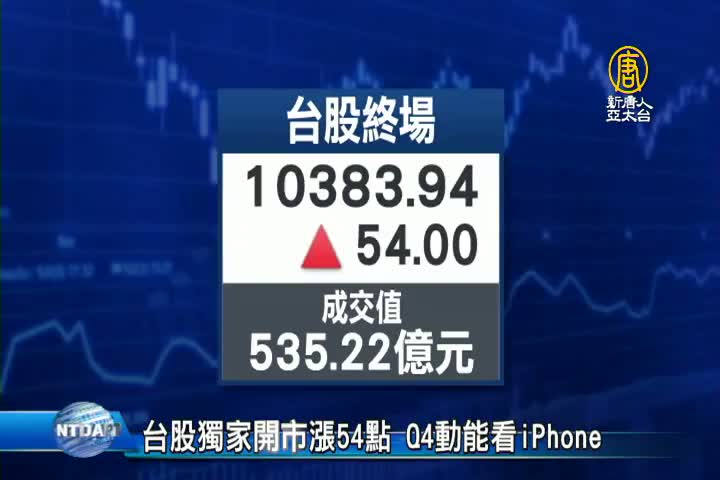 【新唐人亞太台 2017 年 09 月 30 日訊】再來看到,台股今天全球獨家開市,外資休假、量能縮減,開盤後小漲50多點,指數多持穩在10380點左右,收盤上漲54點、以10383.94點作收,交易量只有535.22億元;估計第4季在iPhone新機效應帶動下,整體經濟將持續上揚,預期台股動能,將來自於網路和雲端伺服器升級趨勢,以及電動車生產商Tesla的Model 3車型,將在第4季,達到最大量產。
