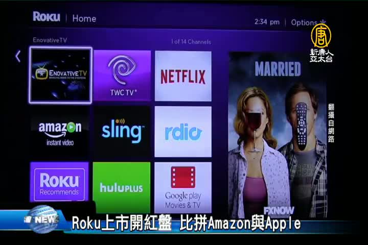 【新唐人亞太台 2017 年 09 月 30 日訊】台北電視節,剛剛落幕,電視產業,因為數位網路,而有了相當大的改變,其中,影音串流,就扮演關鍵角色,來看到,美國串流裝置製造商Roku,本週在那斯達克上市,第一天就大漲了67.86%。市場競爭實力,足以與谷歌,亞瑪遜,以及蘋果較量。