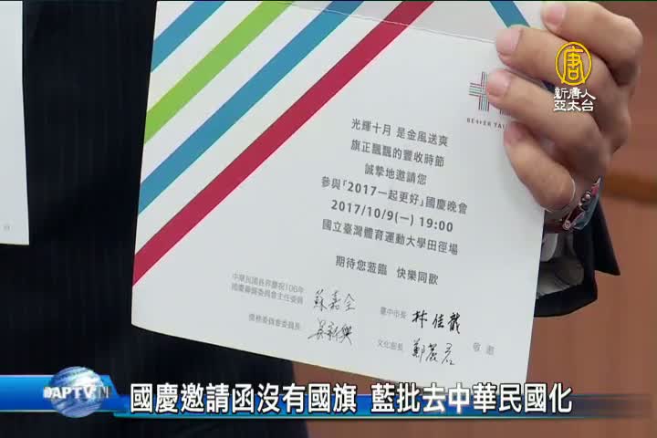 【新唐人亞太台 2017 年 09 月 30 日訊】再來關心,雙十國慶邀請函,由籌備委員會寄發給各界貴賓,國民黨主席吳敦義,也將出席雙十國慶。不過國民黨批評,國慶邀請函上沒有國旗圖騰,而前一晚的國慶晚會邀請函,不僅沒有國旗,更沒有中華民國字樣。認為說,這是民進黨政府,在去中華民國化。