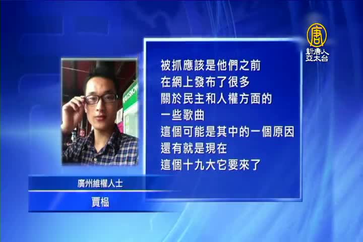 廣州維權人士 賈?:「被抓應該是他們之前在網上發布了很多關於民主和人權方面的一些歌曲,這個可能是其中的一個原因,還有就是現在這個十九大它要來了,各個地方的維穩系統都在進行抓人的這種維穩工作。」