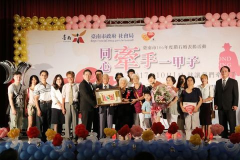 台南市今天(1日)舉辦「106年鑽石婚表揚活動」,台南市代理市長李孟諺親自獻上祝福。(台南市政府提供)