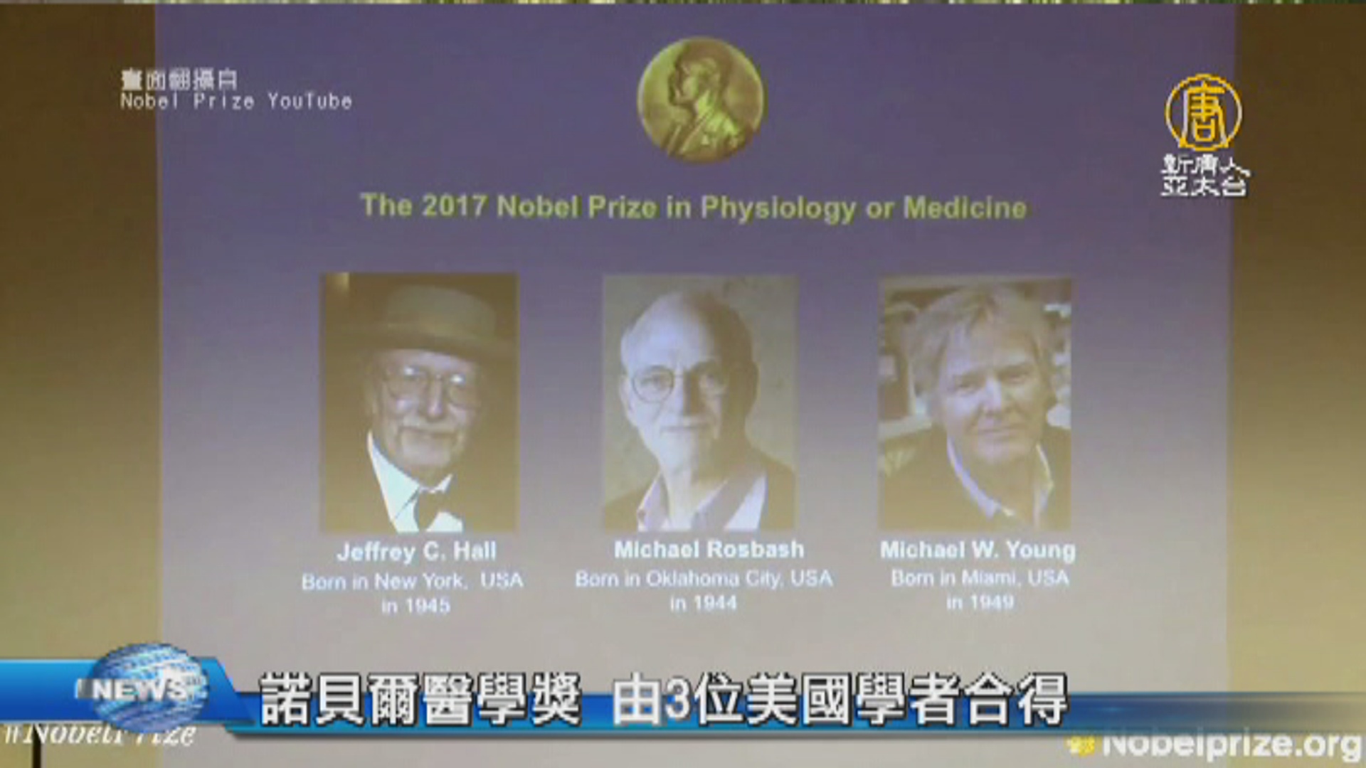 【新唐人亞太台 2017 年 10 月 02 日訊】再來看到,2017年諾貝爾獎今天揭開序幕,醫學獎得主率先揭曉,由美國3名學者:霍爾、羅斯巴希和楊恩獲得殊榮,表揚他們發現了控制生理時鐘的分子機制。明後兩天,將分別公布物理學獎,以及化學獎得主。