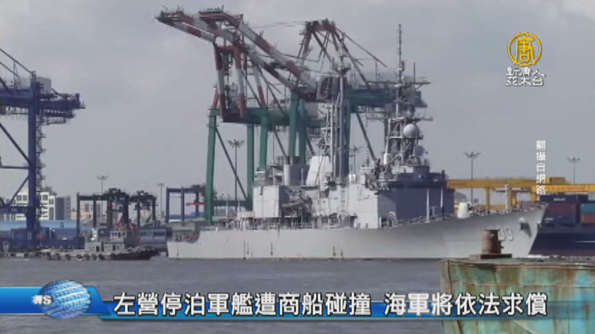 【新唐人亞太台 2017 年 10 月 03 日訊】左營軍艦「基隆級驅逐艦」,上午停泊在旗津碼頭,艦尾遭到商船碰撞。海軍表示,此意外事件沒有造成人員受傷,裝備損傷部分正在調查中。目前已聯繫高雄航港局,查明商船肇事原因,並將依法提出求償。