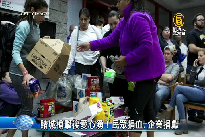 【新唐人亞太台 2017 年 10 月 03 日訊】來看到,在美國賭城發生槍擊案後,隔天一早,大量的美國民眾,是自發請假,湧進賭城三個捐血中心,並等候幾個小時,要給傷患捐血,商家則主動提供民眾免費飲食。當地一些飯店業者,也免費提供受害者家屬房間;還有就是,美國忠實航空提供免費航班;以及,來看到,租車公司 Uber 和 Lyft,免費提供計程車服務。另外,格鬥聯盟也捐助了一百萬美元,幫助受害者。