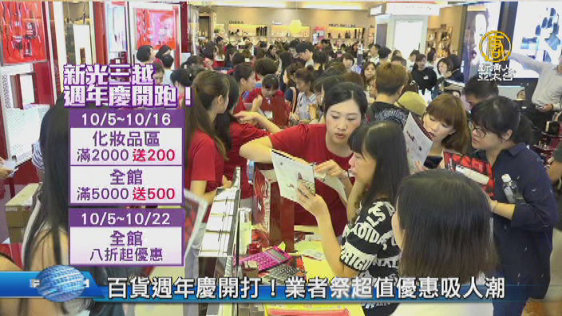 【新唐人亞太台 2017 年 10 月 05 日訊】再來看到,女性朋友們為之瘋狂的,百貨公司週年慶開跑了,新光三越以及統一時代百貨紛紛祭出,化妝品滿2000送200,全館滿5000送500的吸睛優惠,消費者更是花錢不手軟。